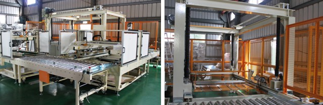 电脑显示器偏光板自动包装线-产品装入纸箱后进入自动封箱机内,完成上下及角边封胶带作业后,再进入栈板自动堆叠机内,将纸箱平整自动堆叠在栈板上.
