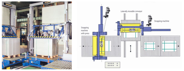 使用两台上压式穿剑捆包机VTS45E-C,配合滚轮输送机,不需要90度转向机构,就能完成#字型捆包。