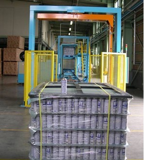 马口铁制罐包装线,使用A-72AO穿剑士捆包机,和WRA旋臂式裹包机,将堆叠完成在棧板的空罐先完成捆包,再缠绕纏繞膠膜,便于空罐的存储和运输。